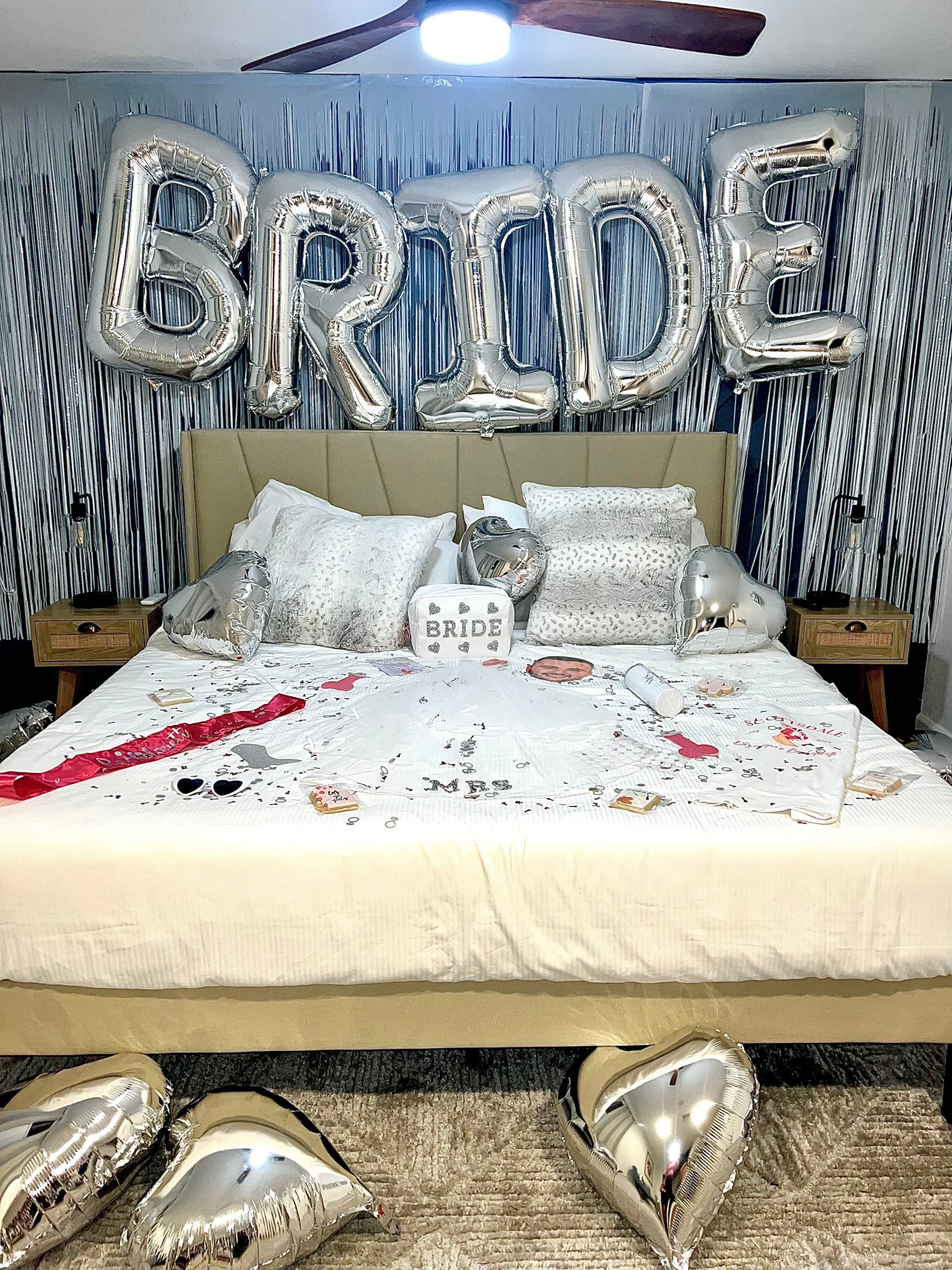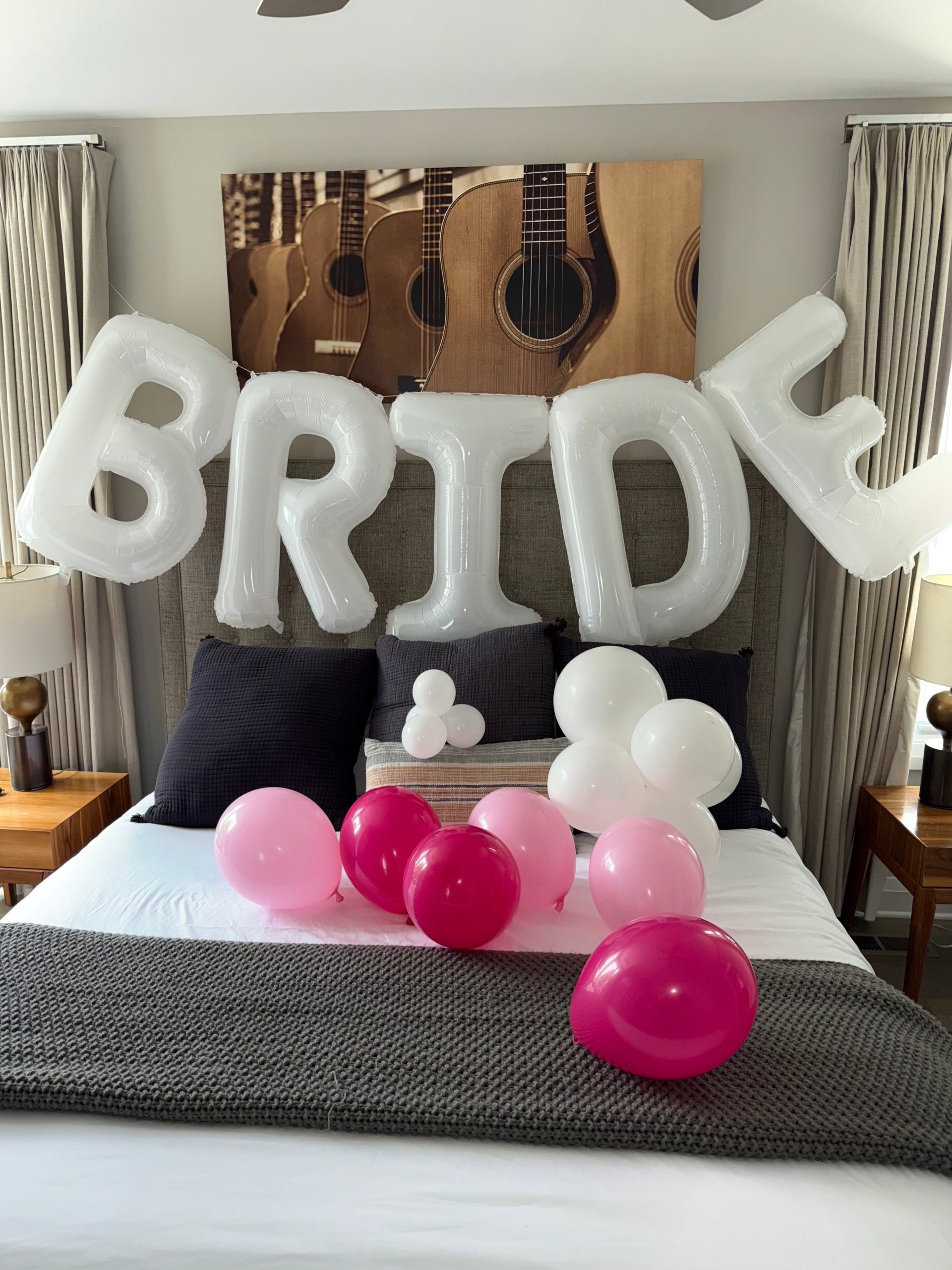 Spell it out in style! This add-on includes foil BRIDE letter balloons perfectly placed above the bride’s bed for that wowmoment when she walks in. It’s simple, cute, and totally Instagram-worthy — because her room should feel just as special as she is!
