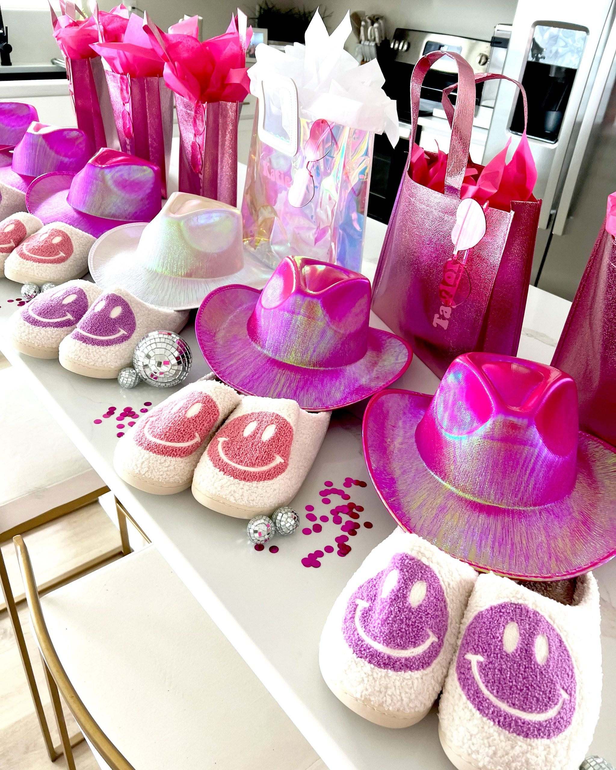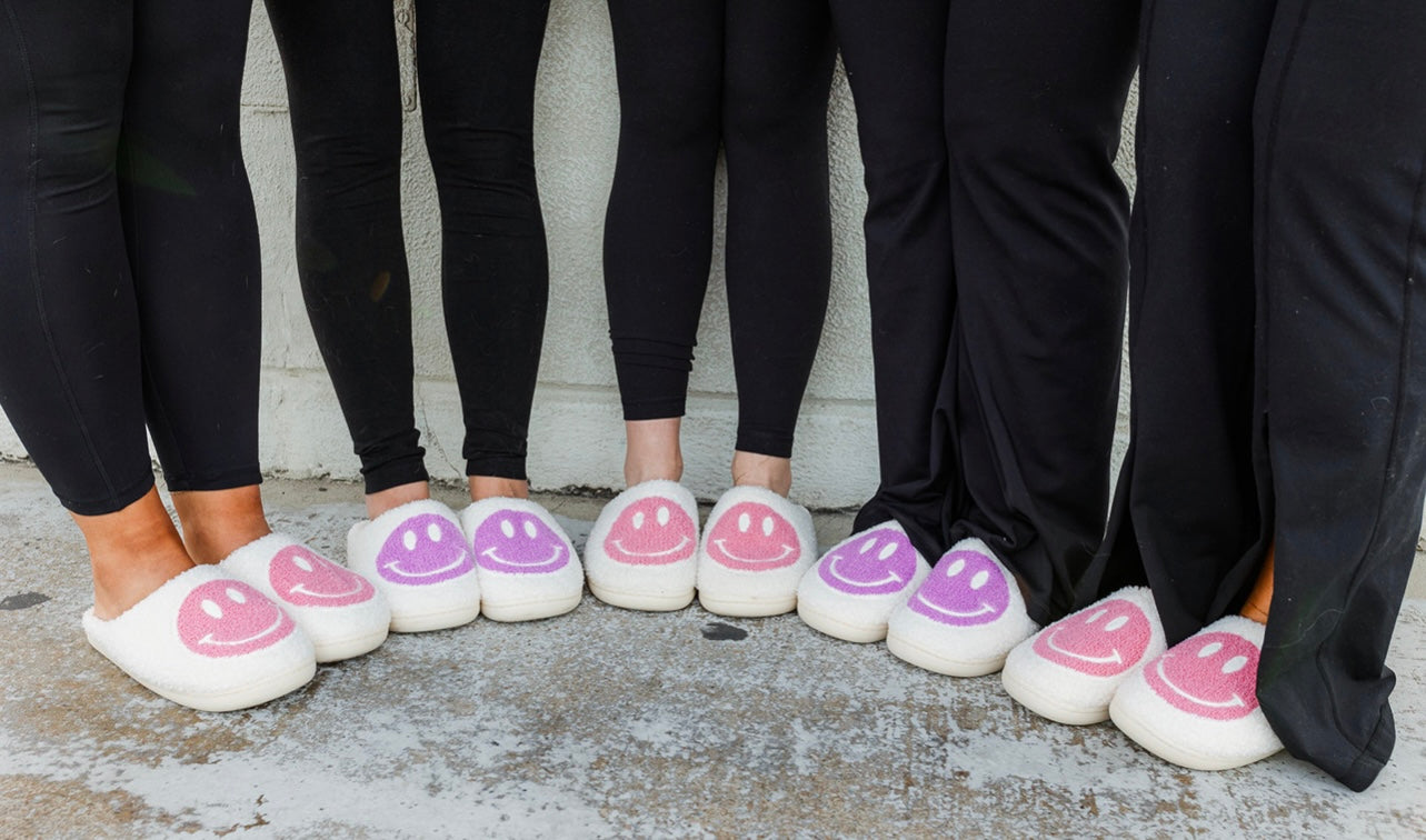What better way to celebrate the first night of a bachelorette than a pj night with these fun smiley slippers to match the fun designs in our shop!! Pink and Purple
